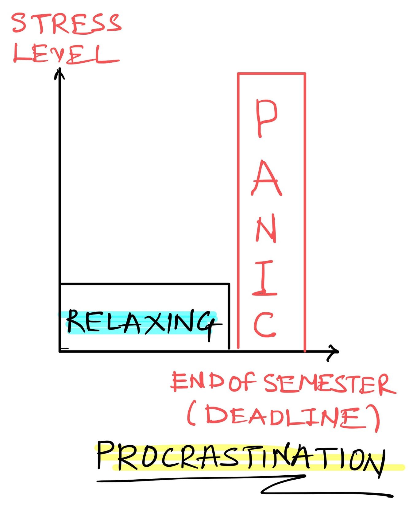 A simple graph explains the behavior of students during their semester. He will be relaxing during the initial time and then pushing hard towards the end of the semester and experiencing panic and stress.